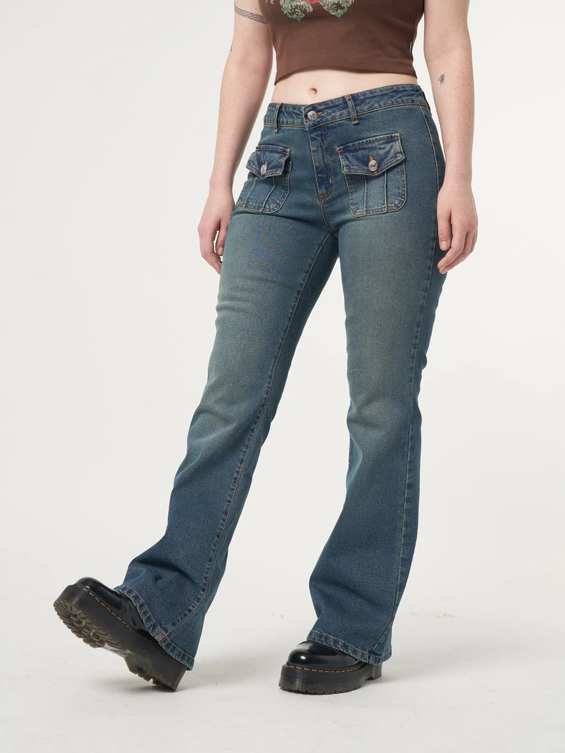The Minga London Jade Overdye Front Pocket Flare Jeans are amazing. The fit is perfect, and the overdye effect is stunning. The flare adds a nice retro feel, and the front pockets are very practical. Highly recommend!