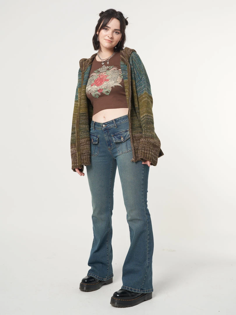 The Minga London jeans are fantastic. The front pockets are a great detail, and the flare makes them stand out. The overdye effect gives them a unique look that’s perfect for any casual outing. Love them!